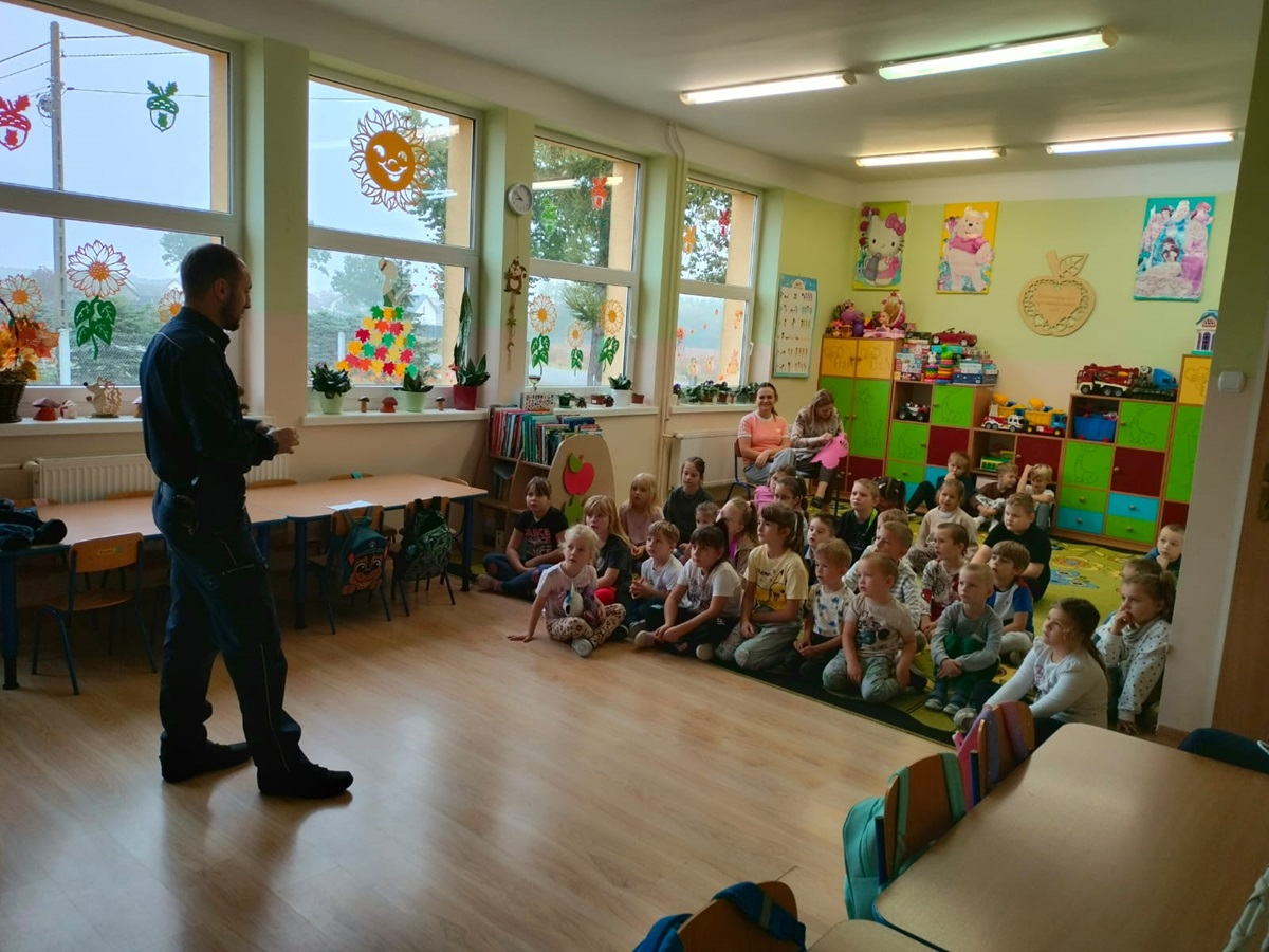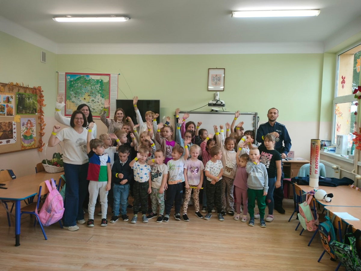 Policjant zaprezentował dzieciom tubę, dzięki której mogły zobaczyć jak w ciemności wygląda osoba mająca przy sobie taki gadżet, a jak bez. Na zakończenie spotkania rozdał wszystkim opaski odblaskowe, aby zwiększyć bezpieczeństwo maluchów.