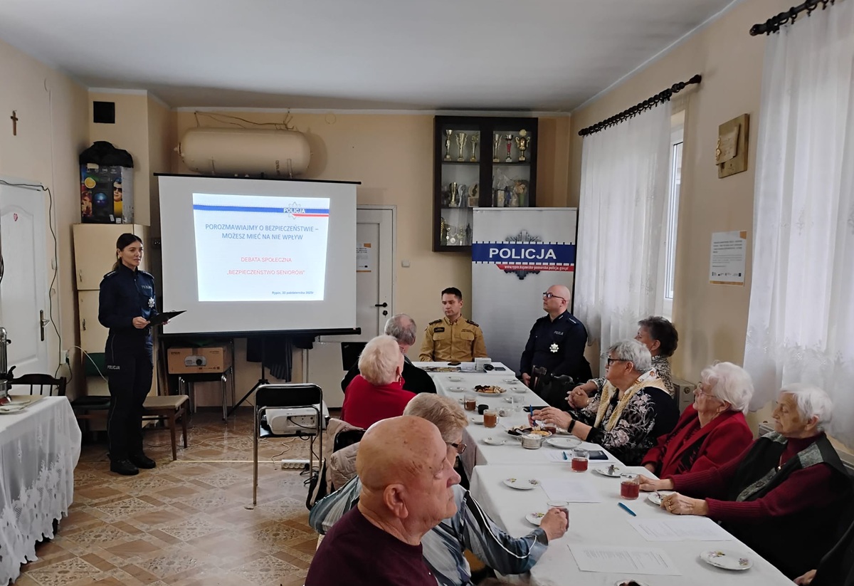 Rypińscy policjanci zorganizowali debatę społeczną z seniorami, by porozmawiać o ich bezpieczeństwie. Podczas spotkania funkcjonariusze przedstawili uczestnikom ważne zasady bezpieczeństwa oraz rady jak się zachować w sytuacji zagrożenia. Na zakończenie był czas na zadawanie pytań i dyskusję.