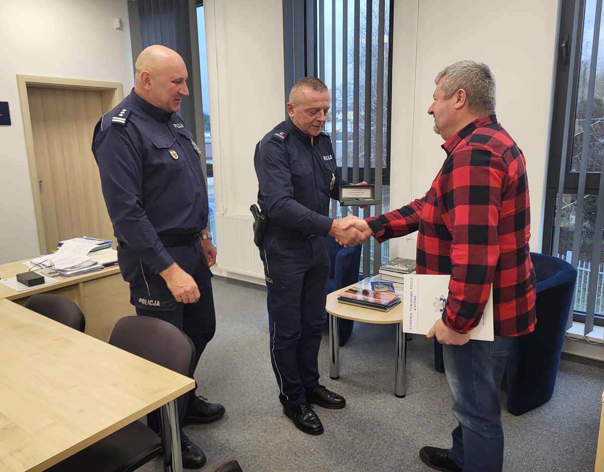 Z tej okazji Komendant Powiatowego Policji w Rypinie insp. Paweł Bartoszewski wraz ze swoim zastępcą mł. insp. Mirosławem Dąbrowskim podziękowali asp. szt. Dariuszowi Calińskiemu za długoletnią współpracę oraz sumienną realizację powierzonych zadań. Wręczyli także list gratulacyjny i miły upominek.