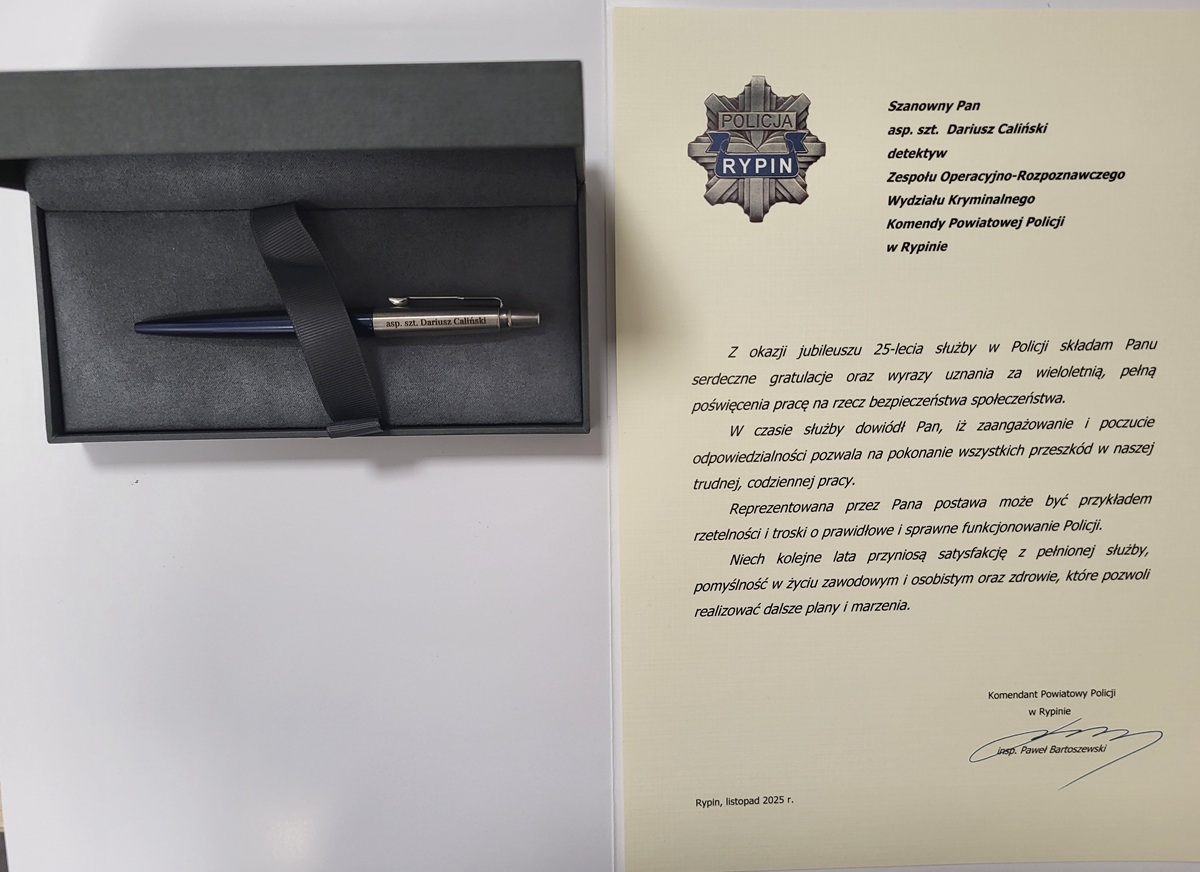 Detektyw Wydziału Kryminalnego Komendy Powiatowej Policji w Rypinie asp. szt. Dariusz Caliński obchodził jubileusz 25-lecia pracy zawodowej. Z tej okazji odebrał gratulacje i symboliczny upominek.