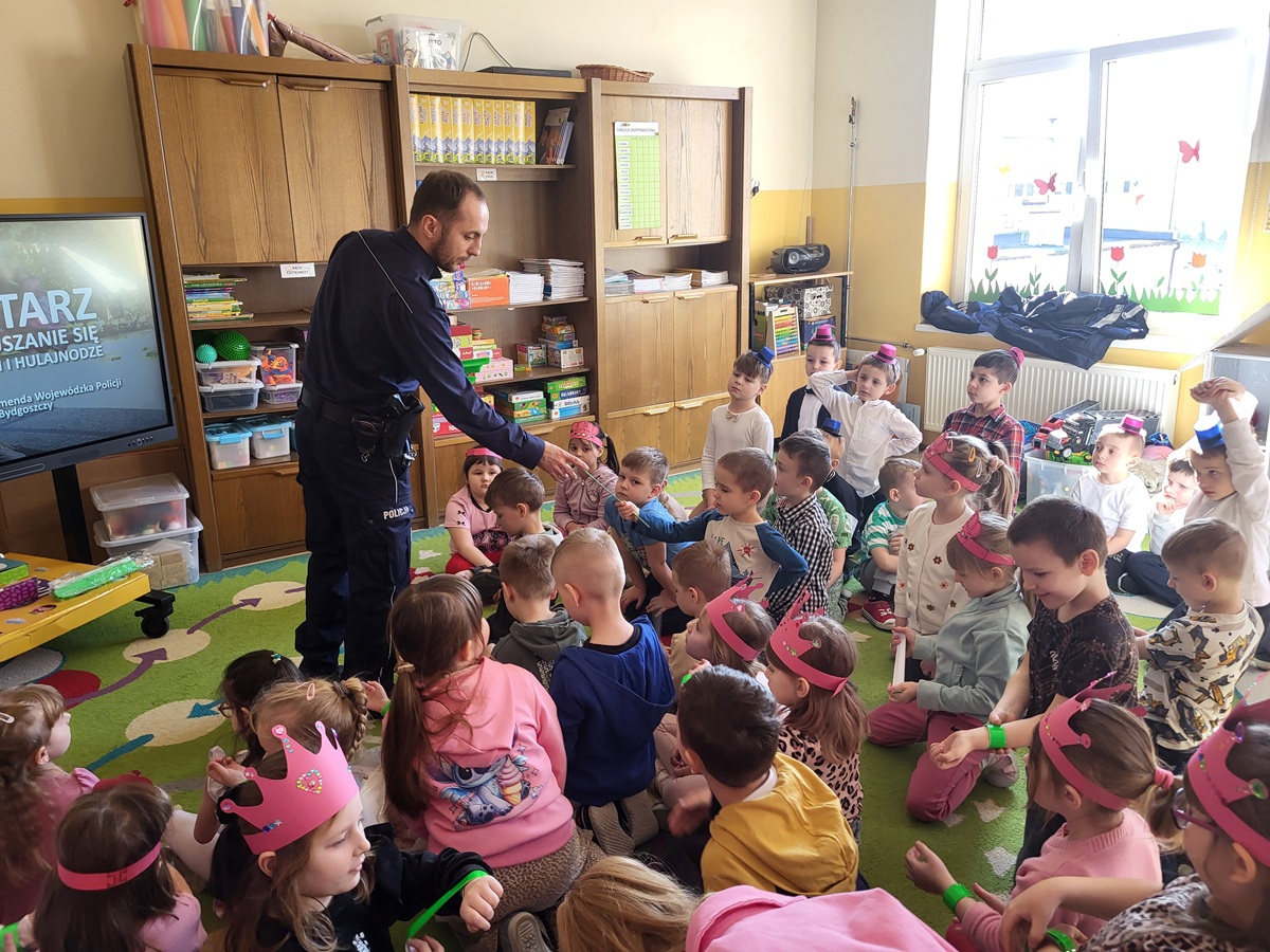 W poniedziałek (9.03.26) policjant zajmujący się profilaktyką społeczną st. asp. Marcin Jackowski odwiedził dzieci w przedszkolu w Skrwilnie.