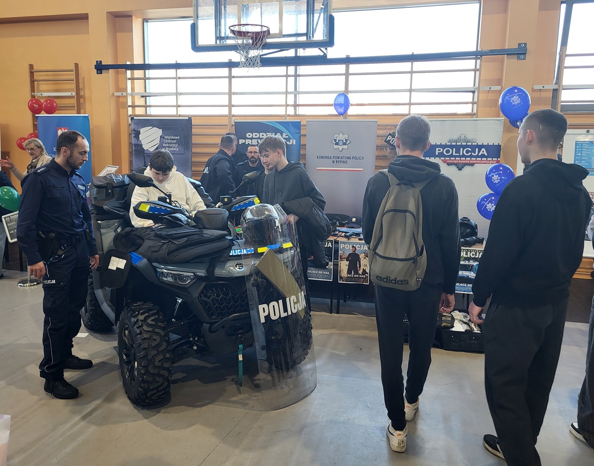 W miniony wtorek (10.03.26) na terenie hali Rypińskiego Centrum Sportu w Rypinie odbywały się Targi Pracy, Szkół i Zawodów zorganizowane przez Powiatowy Urząd Pracy w Rypinie. Na hali stanęło również policyjne stanowisko, przy którym funkcjonariusze z Komendy Powiatowej Policji w Rypinie oraz Oddziału Prewencji Policji w Bydgoszczy byli do dyspozycji zainteresowanych służbą, prezentowali sprzęt policyjny i opowiadali o swoim zawodzie.