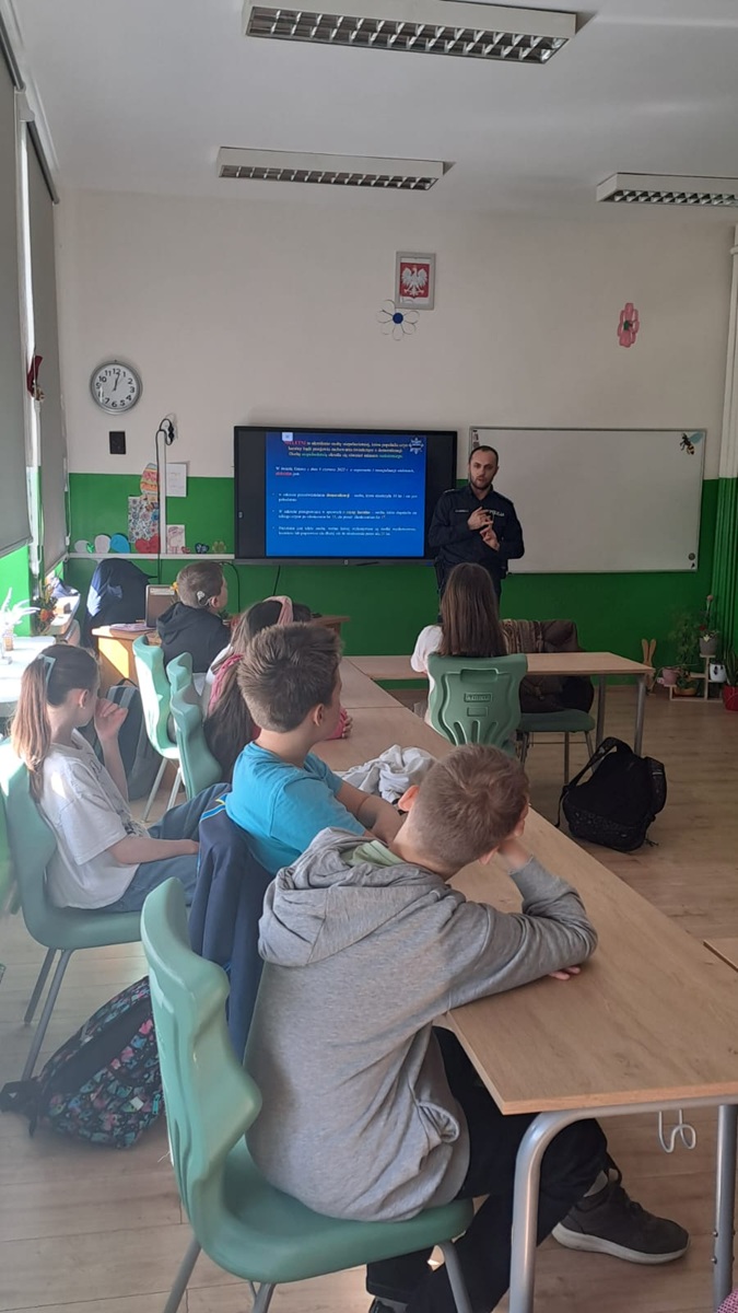 W miniony czwartek (9.04.26) st. asp. Marcin Jackowski zajmujący się profilaktyką społeczną spotkał się z uczniami czwartej klasy Szkoły Podstawowej w Starorypinie Rządowym. Policjant poruszył zagadnienia dotyczące odpowiedzialności prawnej nieletnich za zachowania niegodne z prawem. Dotyczyły one m.in. przemocy rówieśniczej oraz niebezpieczeństw płynących z sieci.